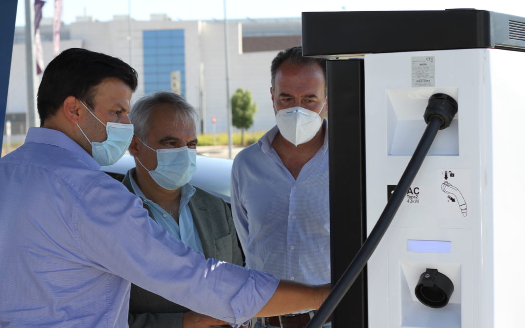 El alcalde de Badajoz, D. Francisco Fragoso, junto con otros responsables del Ayuntamiento de Badajoz, han ofrecido una rueda de prensa con motivo de la inauguración de un nuevo punto de recarga para vehículos eléctricos, situado junto a la frontera de Portugal, junto a la sede de IFEBA (Avda. de Elvas – Institución Ferial de Badajoz).